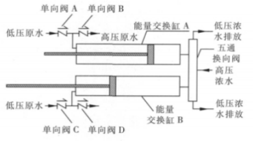 低壓原水從單向閥 A 或單向閥 C 進入能量回收裝置,充滿能量交換缸 A 或 能量交換缸 B;高壓濃水從五通換向閥進入能量回收裝置,當(dāng)五通換向閥使高  壓濃水與能量交換缸 A 連通時,高壓濃水將能量傳遞給低壓原水,實現(xiàn)能量交 換,高壓原水從單向閥 B 進入反滲透膜壓力容器進行脫鹽處理;待將能量交換 缸 A 中的原水全部加壓送至反滲透系統(tǒng)后,五通換向閥,將高壓濃水與能量交 換缸 B 連通,重復(fù)上述能量交換過程,同時能量交換缸 A 中低壓原水進入,排 出低壓濃水。兩個能量交換缸交替進行高壓濃水與低壓原水的能量交換,實現(xiàn)  將低壓原水連續(xù)增壓送至反滲透系統(tǒng)進行脫鹽處理。